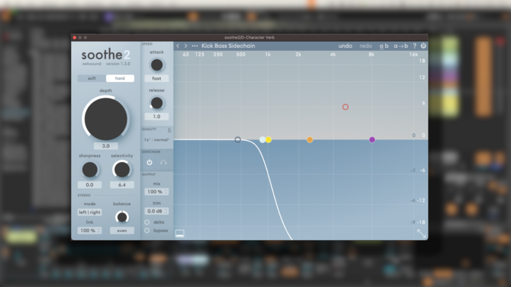 This preset works really well for subtle kick and bass sidechaining. Put Soothe on your bass (group) and select the sidechain input to the kick. Adjust the Depth to taste (although I usually prefer it's default value).